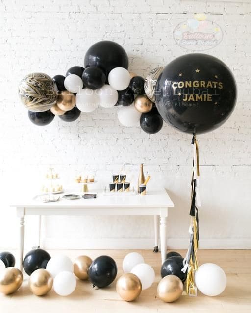 Celebrate new beginnings with classic black and gold balloons, diploma balloons, and a custom message balloons arch – perfect for high school or college grads.
